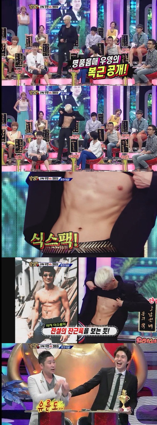 MC Shin Dong Yup asked Wooyoung to show his ripped six pack abs to all the “Strong Heart” viewers. The 2PM member then stood up and lifted his shirt to show his famous “chocolate” abs.