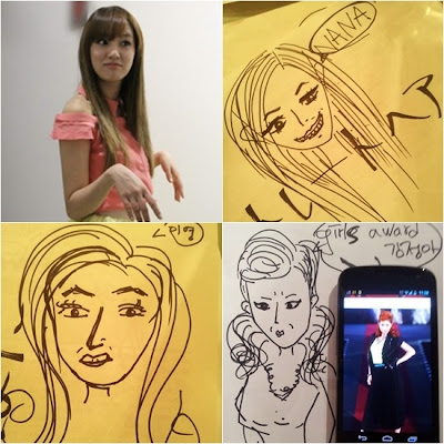 JuYeon drew caricatures of Jung Ah, Nana and E-Young. These pictures showed each members face which were recognizable by individual hairstyles, expressions and facial features like distinctive lips.