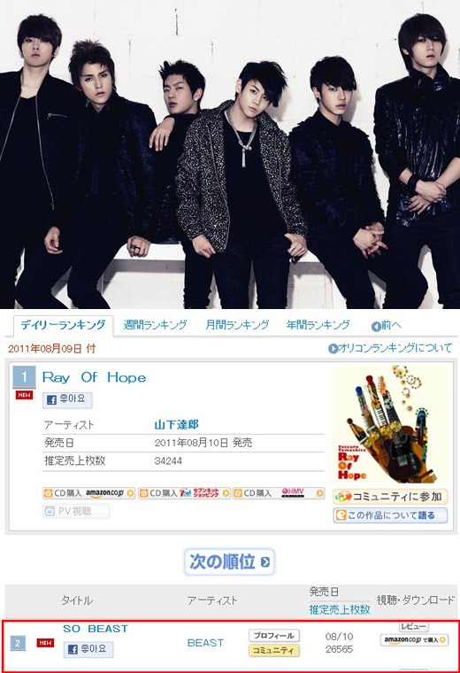 On the 10th Japanese Oricon chart revealed that B2ST’s “So Beast” ranking second, right after Yamashita’s “Ray Of Hope.” The group also ranks no. 1 to 3 on Japanese tower record online sales chart.