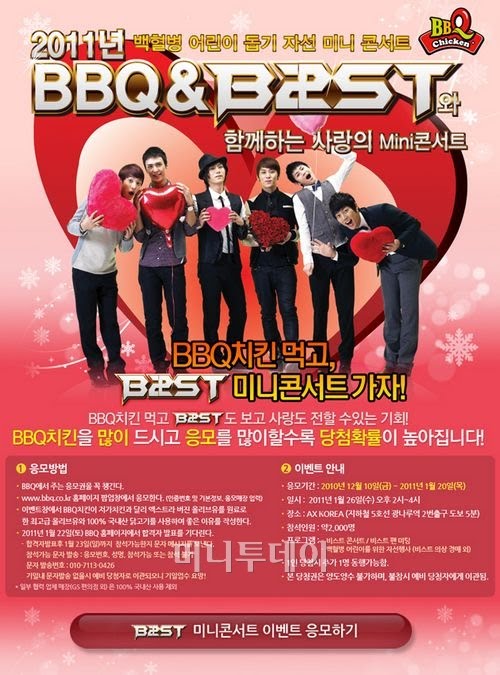 Chicken franchise BBQ is hosting a 'BBQ-Beast Miniconcert' on January 26th at AX Korea, in Gwangjang-dong in Seoul, inviting 2000 of their customers. The concert will be around 2 hours long, starting at 2 in the afternoon. Before the concert, there will also be a charity auction, auctioning off Beast items, to help children diagnosed with leukemia.