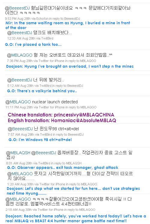 MBLAQ's Mir left a reply on BEAST's Yoon Doonjoon's Twitter, "In the same waiting room as Hyung, I buried a mine in front of the door". Later, G.O said, "I've placed a tank too", proposing a StarCraft battle officially. Yoon Doojoon also challenged G.O, "Hyung, I've brought along an overload*, I won't step on the mines". This provoked G.O, "There's a valkyrie** behind you".