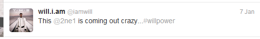 Popular global group Black Eyed Peas member Will.iam's recent tweet on the 7th of January saying "This @2ne1 is coming out crazy...#willpower" has hyped up fans about 2ne1's US debut.