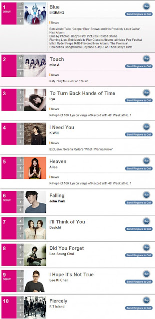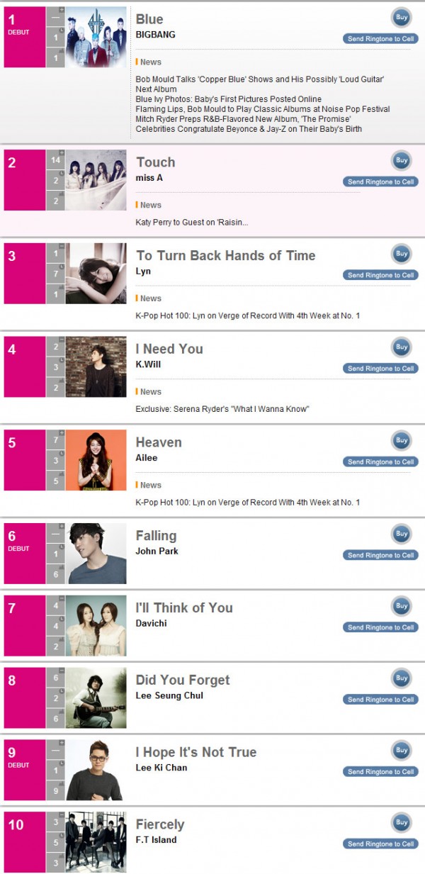On the updated list released on March 1st, Big Bang "Blue" came out on top of the chart. Following Big Bang are the girls of miss A with their comeback track "Touch". Singer Lyn, who has been on #1 for the past three weeks, descended to third spot.