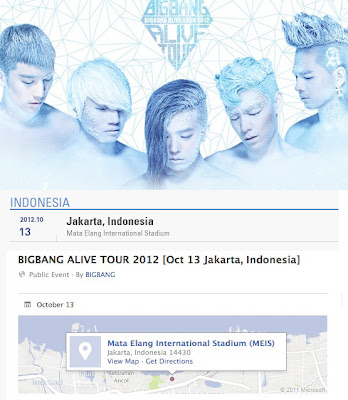 The Asian countries are confirmed but not the dates and venues. However, they just revealed that on October 13 in Mata Elang International Stadium, BIGBANG ALIVE TOUR 2012 in Indonesia will be held.