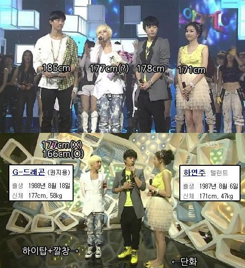 First off, G-Dragon's profile says that he is 177 cm tall. However, on SBS "Inkigayo," G-Dragon appears to be shorter than 2PM's Taecyeon and Wooyoung, but surprisingly also shorter than the female MC, Ha Yeonju. People are claiming that he even had lifts inserted in his shoes, but he is still shorter than Ha Yeonju. Seungri, who is recorded to be the same height as G-Dragon, was also compared. When Seungri is standing next to Goo Hyesun, there seems to be not much of a different. However, Goo Hyesun is recorded as 163 cm. Goo Hyesun does have boots on, but netizens are claiming there is no way Seungri is 177 cm.
