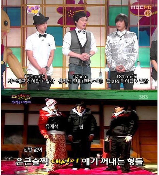 TOP, who is known to be the tallest member at 181 cm, is also gathering attention. He appears to be shorter than Yoo Jaesuk, who is 175 cm. In a photo in which both Yoo Jaesuk and TOP are barefoot, he looks even shorter. People are asking with doubt "Is he even over 180 cm?"