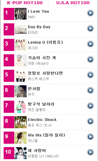 Elsewhere on the chart, SISTAR descends to the No. 3 spot from No. 1, while Busker Busker’s “If You Really Love Me” and “It’s Hard To Face You” lands on the No. 5 and No. 11 spot, respectively. FNC Entertainment’s new face Juniel jumps into the Top 10 at No. 9 with “Illa Illa,” while her labelmate Lee Jong Hyun of CNBLUE debuts in at No.10 with his solo track, “My Love.” Wonder Girls’ English collaboration withAkon “Like Money” gets an early start on the chart beginning at No. 46.