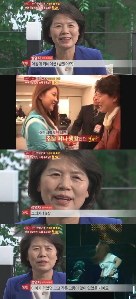Sung Young Ja revealed, “BoA was 16 years old when she made her debut in Japan. Due to the intense amount of stress she received, she was admitted into a hospital for one whole week. During that one week, she lost 22 pounds (10 kg) of her weight. I cried when I heard that.”