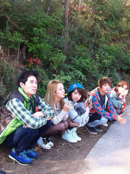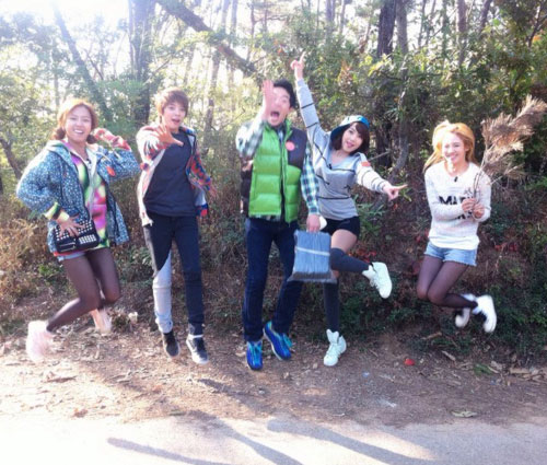 In the photos are the new fixed cast such as SNSD's Hyoyeon, Kara's Jiyoung and F(x) Amber. In the first photo they are sitting comfortably in a mountain side while in the othe rone they are happily jumping in the air.
