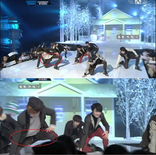 There is a part from the choreography where the members have to swing their legs with their knees on the floor, in this step Minwoo accidentally ripped his trousers. After the broadcast, the video has been spread immediately and puts Minwoo into humiliation.
