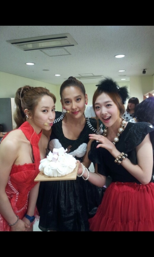 The scene of Sunday and Sulli holding a birthday cake with Dana standing between them was captured in the greenroom of SBS’s music live show Popular Song. Sulli is one of the emcees of the show.
