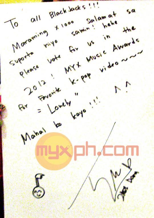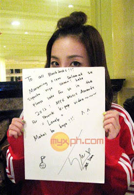 During 2NE1's brief stay in the Philippines, Dara made a personal message to all the Blackjacks to vote them for the 2012 MYX Music Awards!