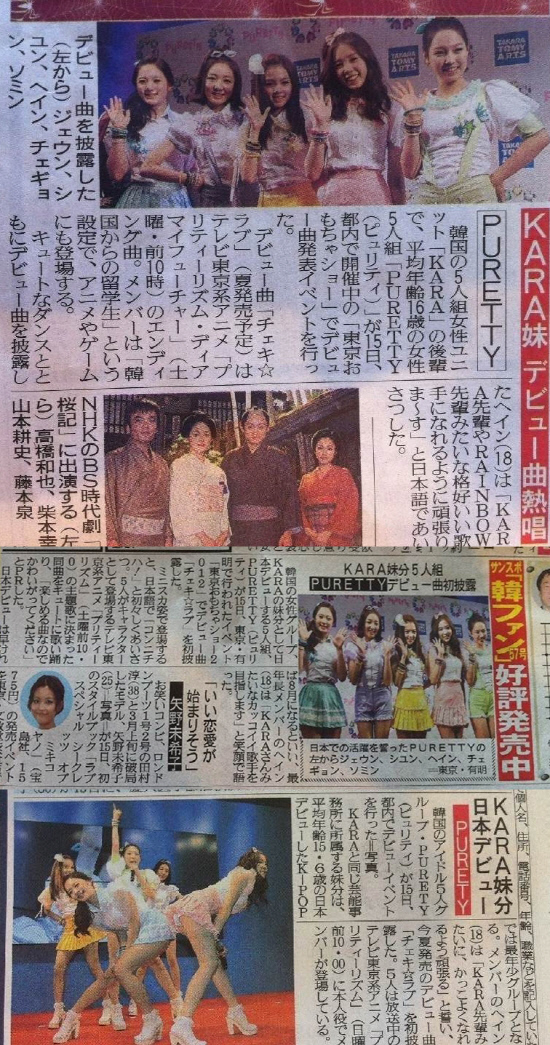 On June 15th, female quintet PURETTY held its first official stage at the three-day, Japan’s largest toy exhibition, ‘Tokyo Toy Show 2010’. The group performed “Cheki Love” which is the theme song for their animated TV show, “Pretty Rhythm – Dear My Future”. All of the major Japanese sports media reported on the performance.