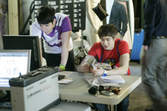 Junsu and Nichkhun take a short break during the photo shoot. Junsu is web surfing while Nichkhun reads.