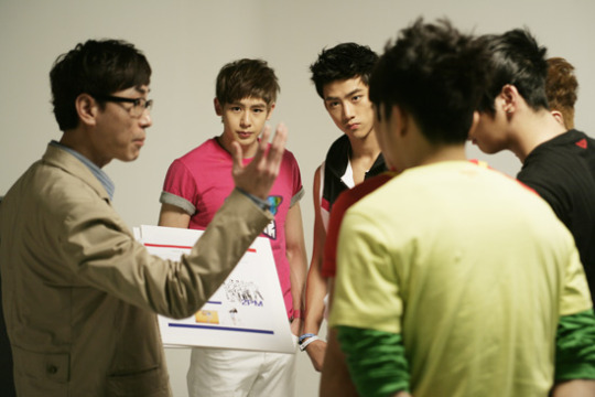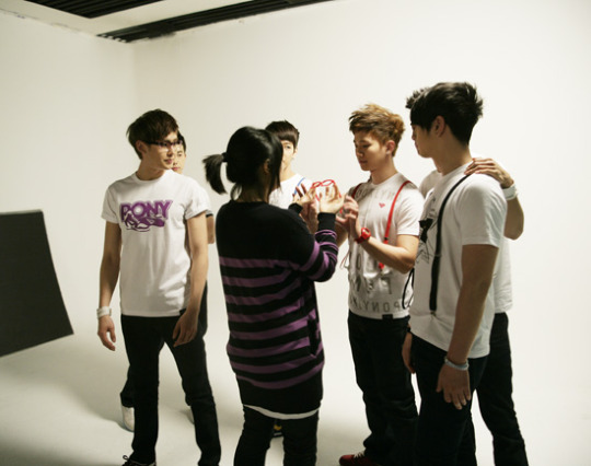 The 2PM members are listening to the photo shoot concept from the director. Nichkhun and Taecyeon look very serious.