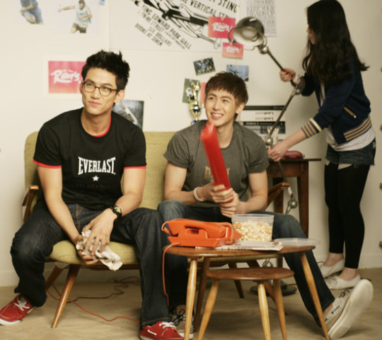 While a staff member checks the props during the shoot, Taecyeon and Nichkhun converse with the other members. Taecyeon gives off an intelligent image with his glasses while Nichkhun strengthened his usual cute image.