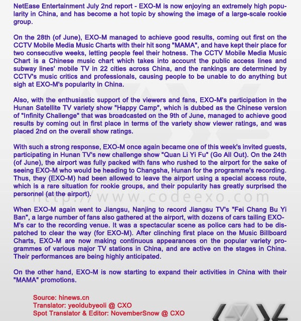 [NEWS] EXO-M occupies the first position on music charts for two consecutive weeks, has high viewer ratings on variety programme appearances! EXOangelclowie18Jul 05, 2012 Share 0 comments Tags: Exo, Exo-m, News Share Previous articleNext article Leave a comment Name Email Content Post comment
