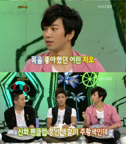 G.O elaborated, "I didn't really like them, but because my older sister liked them, I liked them with her." The group that G.O's sister fangirl-ed for was the original beastly idols, Shinhwa. When asked why he didn't like Shinhwa, G.O replied, "At the time I like rock. I liked Kim Kyung Ho, but my sister would give me orange balloons and tells me to blow them up." (Note: If it wasn't obvious already, orange is Shinhwa's color.)