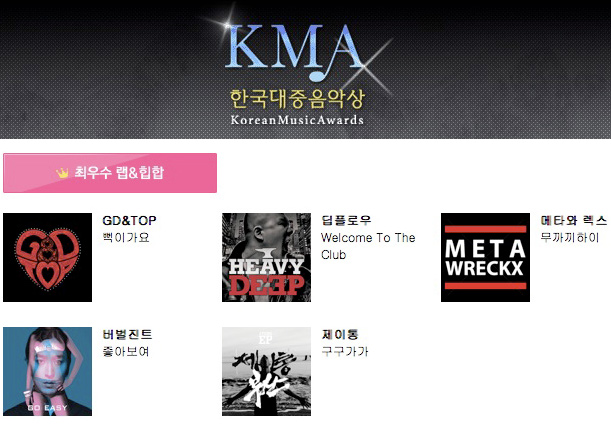 The list of the nominees for the 9th Korean Music Awards is out and GD&TOP's "Knock Out" (Ppeokigayo) is nominated for Best Rap/Hip-Hop.