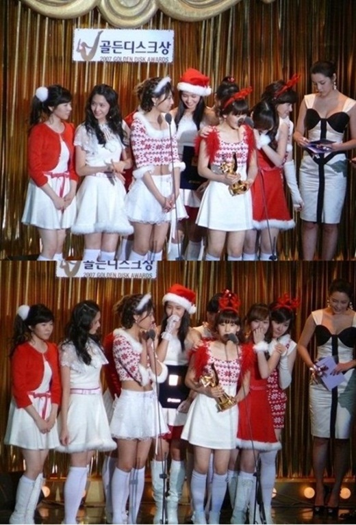 Recently, several pictures of Girls’ Generation standing on stage with Park Si Yeon with the title “Actress Park Si Yeon overwhelms Girls’ Generation” were posted on online community board. The pictures were taken from the 2007 Golden Disk Awards.