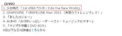 But a year later, Girls’ Generation have surpassed themselves, proving their popularity in the Japanese music industry once again. Tower Records’ newly released ranking of the week’s sales show that Girls’ Generation’s first concert DVD; “1st ASIA TOUR: Into The New World”, released on August 19th, has taken the top spot being the highest selling DVD between August 15-21st, despite being released more than halfway through the week.