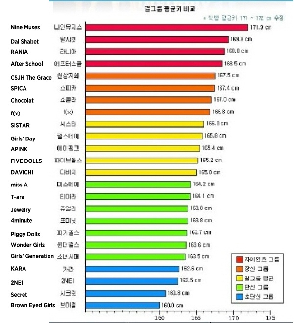 A total of 24 groups were listed in the ranking. As expected, having composed of former models, Nine Muses took #1 spot with an average height of 171.9 cm. After School, well-known as 'tall' girl group in the K-Pop industry, came in a surprising fourth with an average height of 168.5 cm.