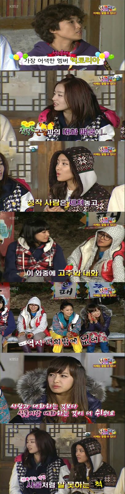 f(Victoria) was chosen as the most awkward members with 4 votes. Sunhwa who picked her said, "By talking to plants, you look like a 4-dimensional person." Hyomin added, "I know it is really difficult to try to talk (in Korean) and to engage the dialogue, and then ending up by having your pride hurt."