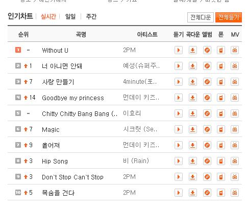 Secret overtakes Rain's "Love Song" at no.5 with their song "Magic" at no.4 while Younha's "nonsense" takes the 6th spot followed by Rain at no.7 with "Hip Song".