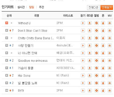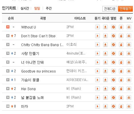 Meanwhile, 2pm dominated the real time and daily chart with their title track "Without U" which is both at the number 1 spot. 4 minute also tries to bring the competition with "Making Love" which is an OST for Personal Taste which takes the 3rd and 4th spot for real time and daily chart.