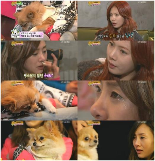 Singer G.Na and 4minute’s HyunA shed tears as they bid goodbye to abandoned dog Cherry.