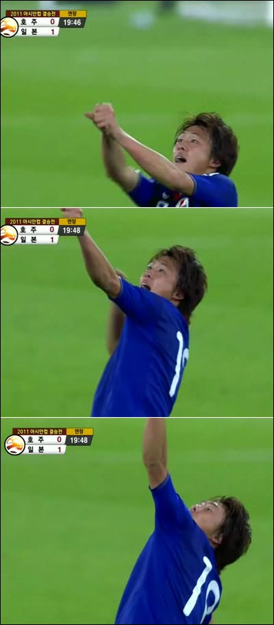 The thrilled Lee Chungsung walked towards the fans after being congratulated by his team mates and did a goal celebration that looks like SNSD’s ‘Hoot‘ arrow dance.