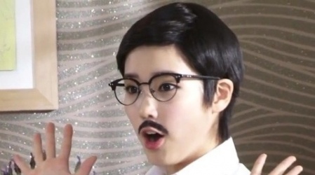 In the photos taken at the set of a commercial for a major supermarket, IU is sporting 8:2 parted hair style, moustache, and round glasses, while donned in a white shirt and sky blue cardigan. However, despite the disguise, the lovely star doesn’t look all that awkward, still cute and charming like a little pretty boy.
