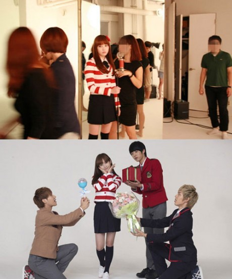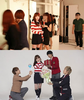 In the behind the scenes photos of IU, she was seen preparing wlong with the staff wearing a read and white striped top, a pencil cut skirt, high black socks and a white sneakers. She is looking pretty with ELITE uniform together with idol group INFINITE.