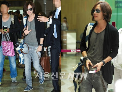 Jang Geun-seok left to Japan through Kimpo International Airport for a press conference and autograph signing session. The press caught him at the airport and he was wearing a gray top with a black cardigan, washing blue jeans and overall achromatic color.