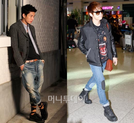 SHINee's member Jonghyun stylishly wore a pair of jeans with differently colored fabric patches at the knees. Furthermore, he folded the leg hems up to the ankles and wore walker shoes showing the trendsetting side.