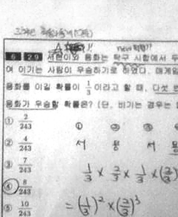 The question was introduced with ‘Seo Hyun and Yong Hwa decided whoever wins two games in a row will be the winner’ and it received a lot of attention when it was posted by one of the student on Dcinside.com’s ‘WGM’ gallery. Along with a picture it said “Math teacher is our homeroom teacher with perfect 10 score for awesome wit” and there were comments that said answer was 8/243.