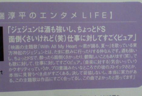 “The movies theme song ‘With all my heart ~Kimi Ga Odoru Natsu~’ is by Tohoshinki and one of the member Jaejoong is a friend of mine that I go drinking with sometimes.