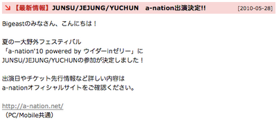 It has been decided that JUNSU/JEJUNG/YUCHUN will be participating in the summer festival "a-nation'10 powered by Weider in Jelly"!