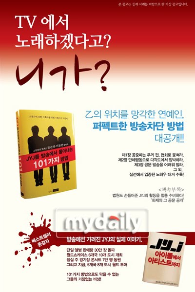 The said advertisment talks about a fictitious book titled “101 Ways To Remove JYJ From Programs” and describes their current inability to appear on television programs, while mocking JYJ, who is current locked in a battle with SME, as “Artist who have forgotten about place B,” attracting a lot of attention.