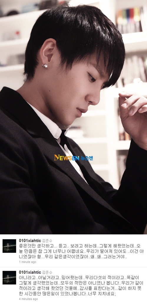 Kim Junsu in the afternoon on January 6th wrote in his twitter, “This can’t be true… I came to believe that the person was the enemy of all five of us, however now I think not all of us see it that way.” “Seeing how you express your gratitude to someone who was our enemy, makes me wondering… there must be a lot of things happened when we were apart for a long time. I’m getting tired.” he wrote.