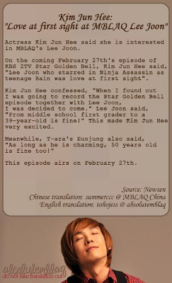 [NEWS] Kim Jun Hee: "Love at first sight at MBLAQ Lee Joon" Lee JoonLittleChillieFeb 28, 2010 Share 0 comments credits:Source: NewsenChinese translation: summerccc @ MBLAQ ChinaEnglish translation: tohojess @ absolutemblaq Tags: Lee joon, Mblaq Share Previous articleNext article Leave a comment Name Email Content Post comment