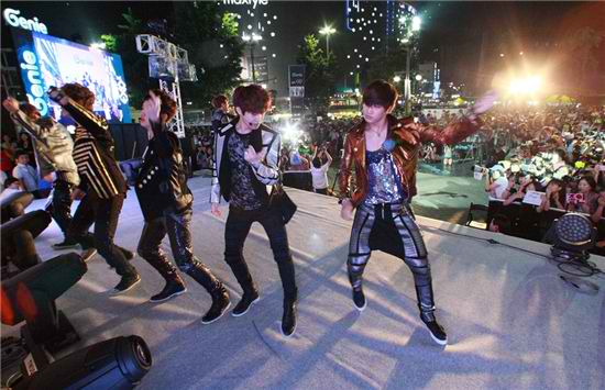 On the 2nd of June, the company KT (President Lee Suk Chae) chose 200 users of their smartphone music service, Genie, to head to the Seoul Dongdaemun Doota Plaza. There, they showed off the "EXO-K with Genie, Augmented Reality (AR) Video Show."