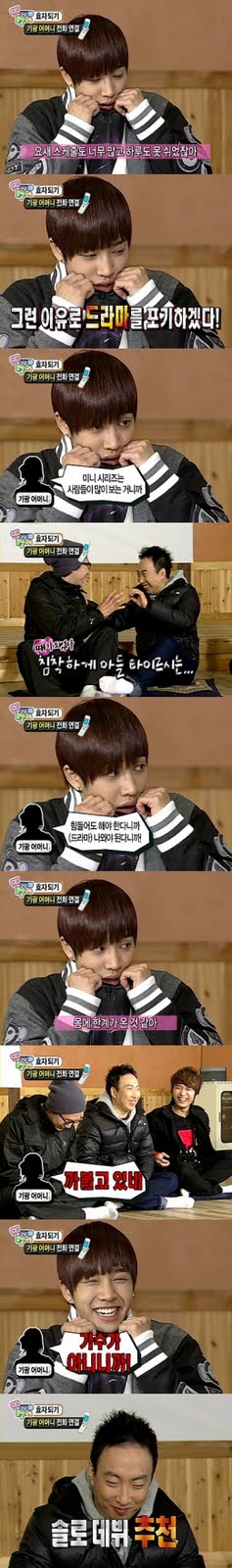 Following this, as soon as Lee Kikwang had whined "It's like the limits of my body are being tested." she persuaded him by saying, "You're making a fuss. You're no good as a singer, so you should act and then come out as a soloist."