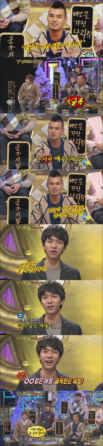 Later on, Lee Jung confessed that “When I went to the market, another ajumoni met my eye. However, this ajumoni said ‘It’s a pity that the kid Lee Seung-gi did not come (to the army)’”, provoking laughter. Lee Jung also provided laughter with his begrudged expression and by saying that “Even though I wanted to demand an explanation from the ajumoni, but I also wanted to ask ‘then what kind of kid am I?’ as well”.