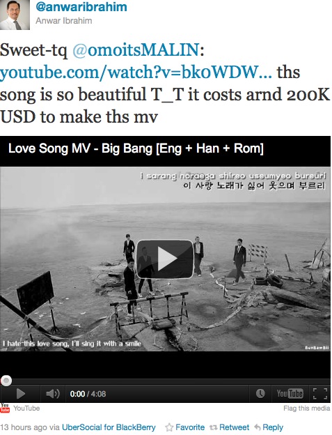 On January 15th, Anwar Ibrahim [@anwaribrahim], a well known politician from Malaysia retweeted a Malaysian VIP's [@omoitsMALIN] tweet about BIGBANG'S Love Song MV. Anwar Ibrahim is the Former Deputy Prime Minister of Malaysia and currently, he is Member of Parliament P44 Permatang Pauh and Opposition Leader, Malaysia.