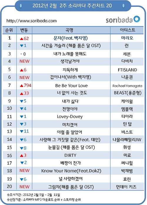 Mario's new song "Text Message" featuring Baek Ji Young is being received well by the public and tops the weekly chart for the 2nd week of February (February 5 to 11) on music chart Soribada.