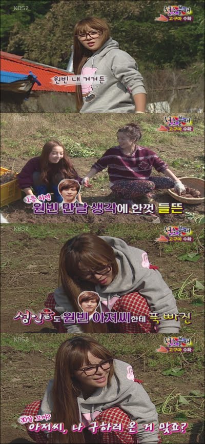 Narsha jokingly was angry and said "Won Bin is mine!" after which she hand dug sweet potatoes with all her strength drawing laughter from the cast.