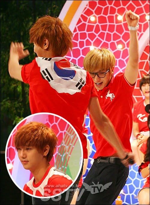 This early morning (0:00 KST), Yesung and other SJ members were present at SBS Shout of Victory event to support the Korean soccer team in their match against Nigeria. However, netizens are raising anger against Yesung's T-shirt which they suppose that the design is of a torn Korean flag,voicing their thoughts that this is some kind of undermining the meaning of the national flag, or this is a very inappropriate choice of clothing. And in short, Yesung is being criticized for purposefully cutting the flag to create his T-shirt and this is degrading