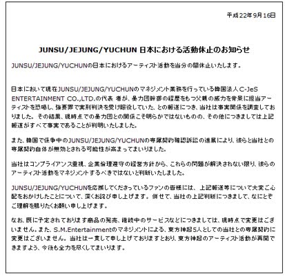The management company in Korea representing JUNSU/JEJUNG/YUCHUN, C-JeS ENTERTAINMENT CO.,LTD’s representative was reported to have been found guilty of using his father’s power and ties with gangs to blackmail the artist he was responsible for, and served time for coercion. Avex has been investigating the validity of news reports, and it was found that, though the speculations of the head’s ties with gangs cannot be verified, the rest of the report stated above was factual.