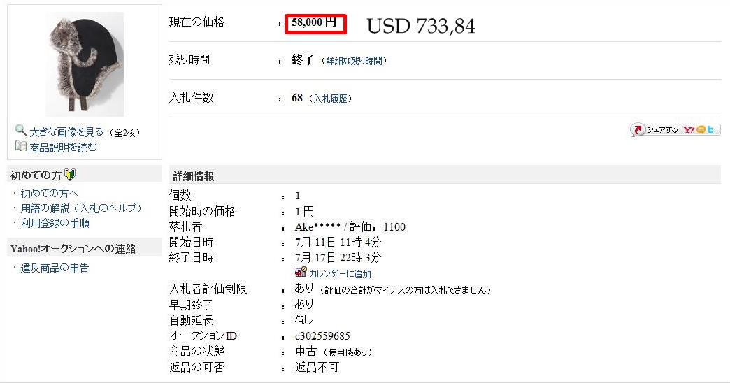 Key's sesame street cookie monster hat bid for 67.000 yen.